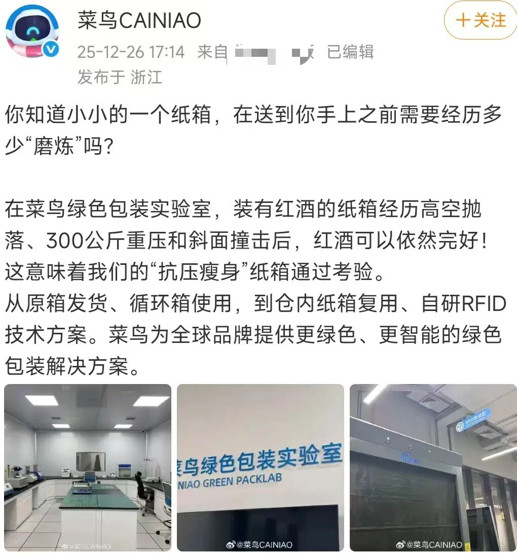 正在物流包拆范畴,平安防护取智能办理一曲是行业逃求的焦点方针。近日,菜鸟旗下绿色包拆尝试室颁布发表研发出一款兼具超强防护机能取智能逃踪功能的RFID快递纸箱,经严苛测试,该纸箱可承受300公斤沉压,从1米多高处频频坠落仍能保障箱内物品无缺,同时借帮内置的自研RFID芯片,实现了货色全链的数字化溯源取办理,为物风行业的包拆升级带来冲破性处理方案。